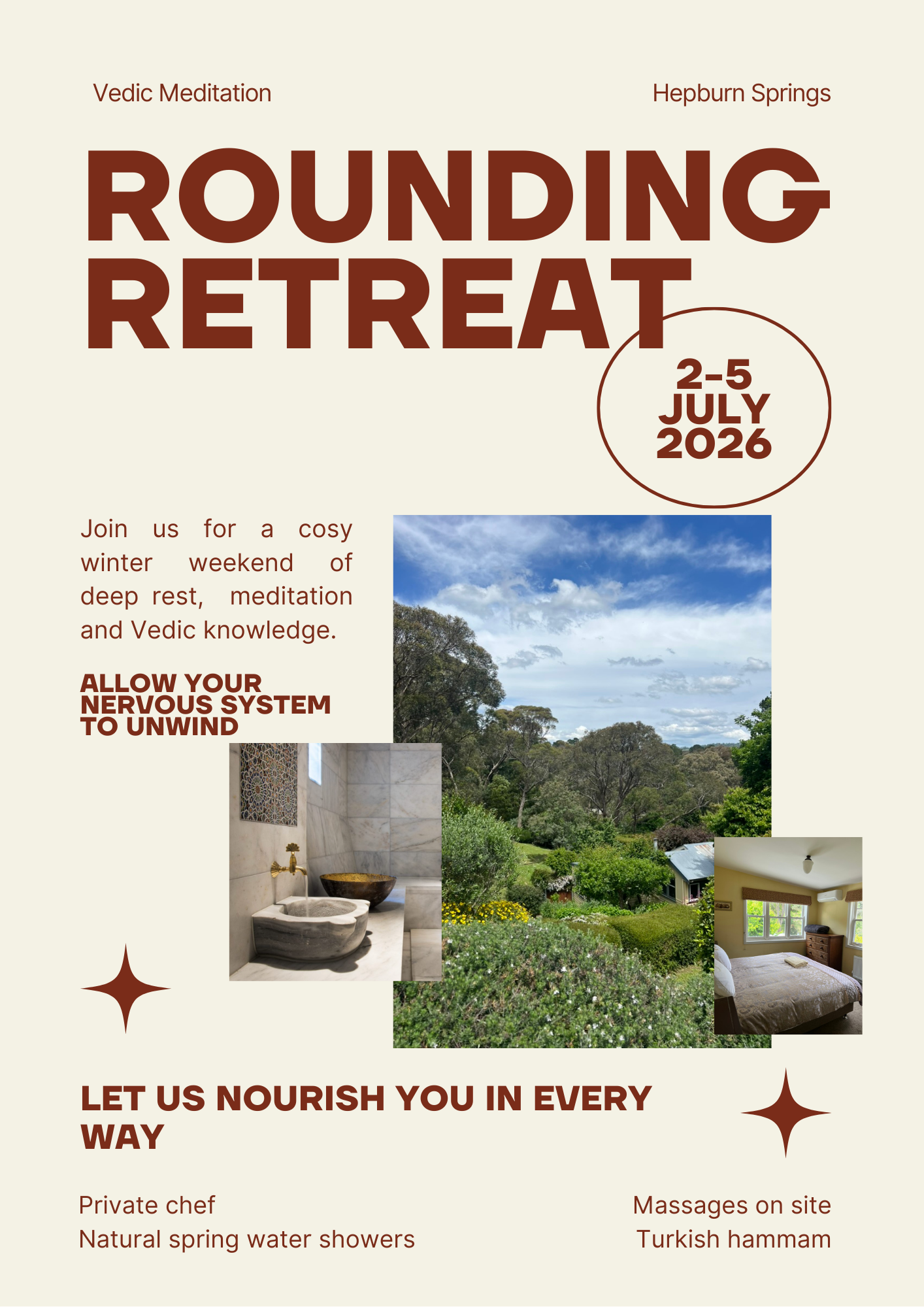 Come join us for a winter rounding retreat July 2-5 in Hepburn Springs. Rounding is a gentle and deceptively powerful technique for accessing deep rest. A weekend of rounding is said to be equivalent to six months of regular twice daily meditation. Of course, it's almost impossible to measure this, however I can attest to how life changing a rounding retreat is myself and I see it in students, there's a glow and peacefulness that appears in everyone's faces at the end of a rounding retreat. It's palpable!